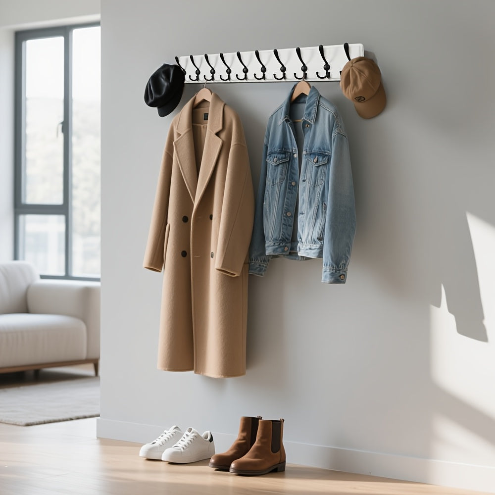 Avec ses nombreux crochets robustes, ce grand porte manteau mural vous offre un rangement efficace pour toute la famille. Parfait dans une entrée, un vestiaire ou un bureau, il supporte vestes, sacs et accessoires sans faiblir. Son design sobre et moderne s'adapte à tous les styles d'intérieur. Gain de place assuré grâce à sa fixation murale discrète.📦 Livré avec sa notice de montage , il s'installe facilement et devient vite un indispensable du quotidien.👉Si toutefois vous avez besoin de plus de modèles la collection porte-manteaux est disponible sur notre boutique.